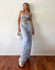 TOP: Printed crinkle chiffon crop top. Adjustable straps. Back tie closure. Partially lined.